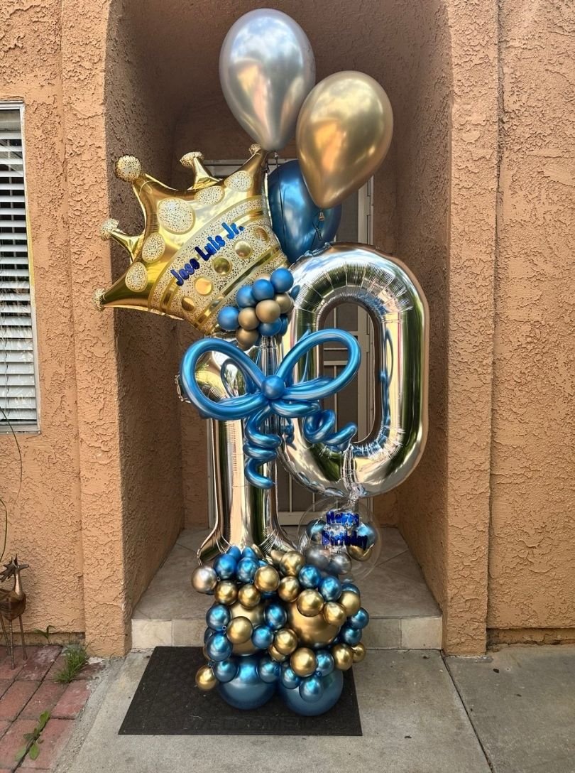 Blue and gold balloon bouquet with crown, bow and number 10,