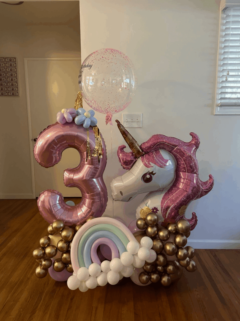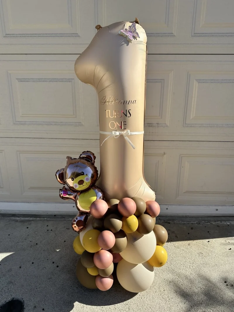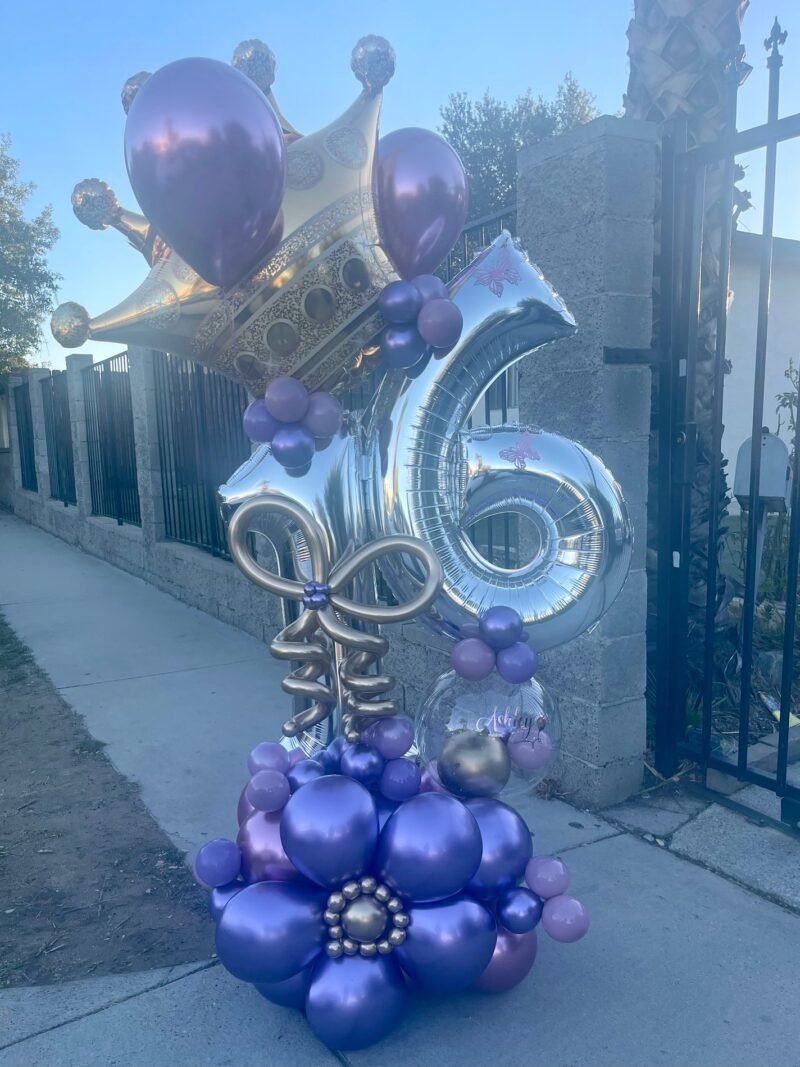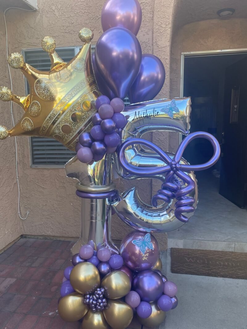 - 3’ by 5’ Balloon bouquet. Take this image as reference since our products are 100% personalized, name color etc. You can always add helium balloons at extra charge.